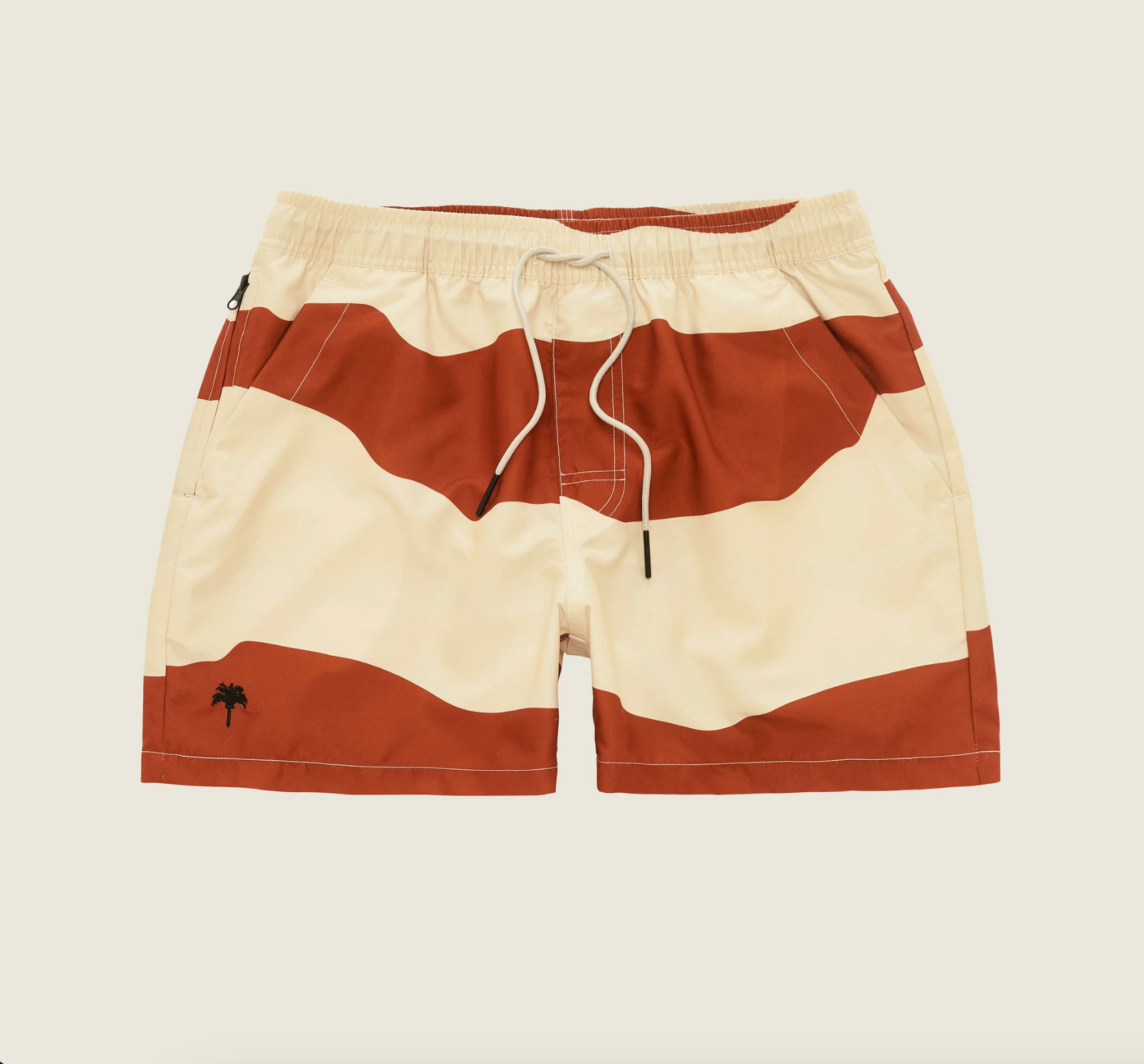The Amber Dune swim shorts are tailored from a brushed, quick-drying shell fabric decorated with a pattern inspired by sunset-soaked desert dunes. Cut for a relaxed, straight fit with an elasticized drawstring waistband and built-in mesh briefs for comfort and support. Keep your keys and cards securely stored in the hidden zip pocket.