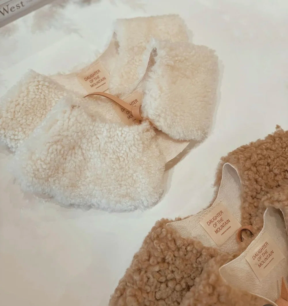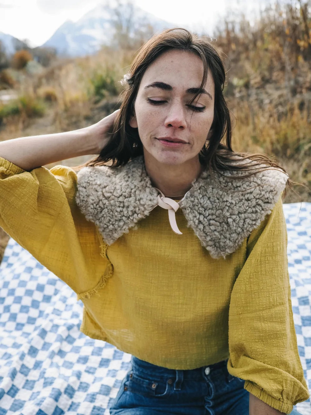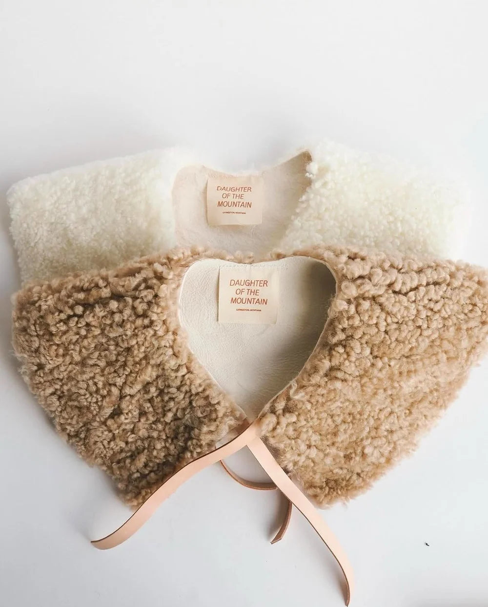 A playful take on the Shepherdess Collar in a shorthair curly hide, in a delicate off-white or taupe/grey color way.