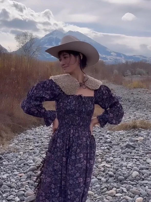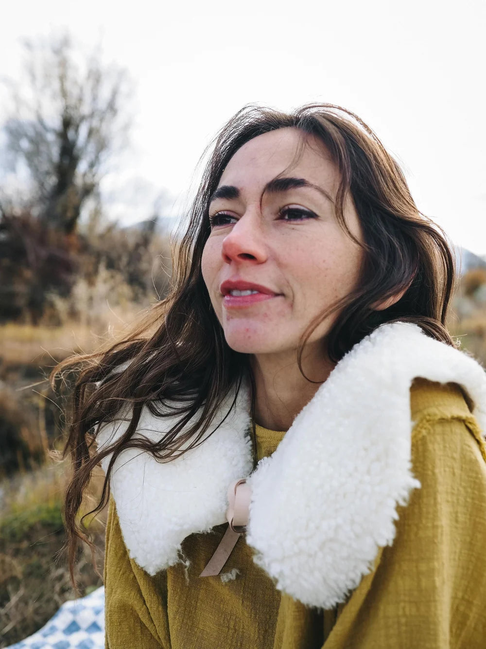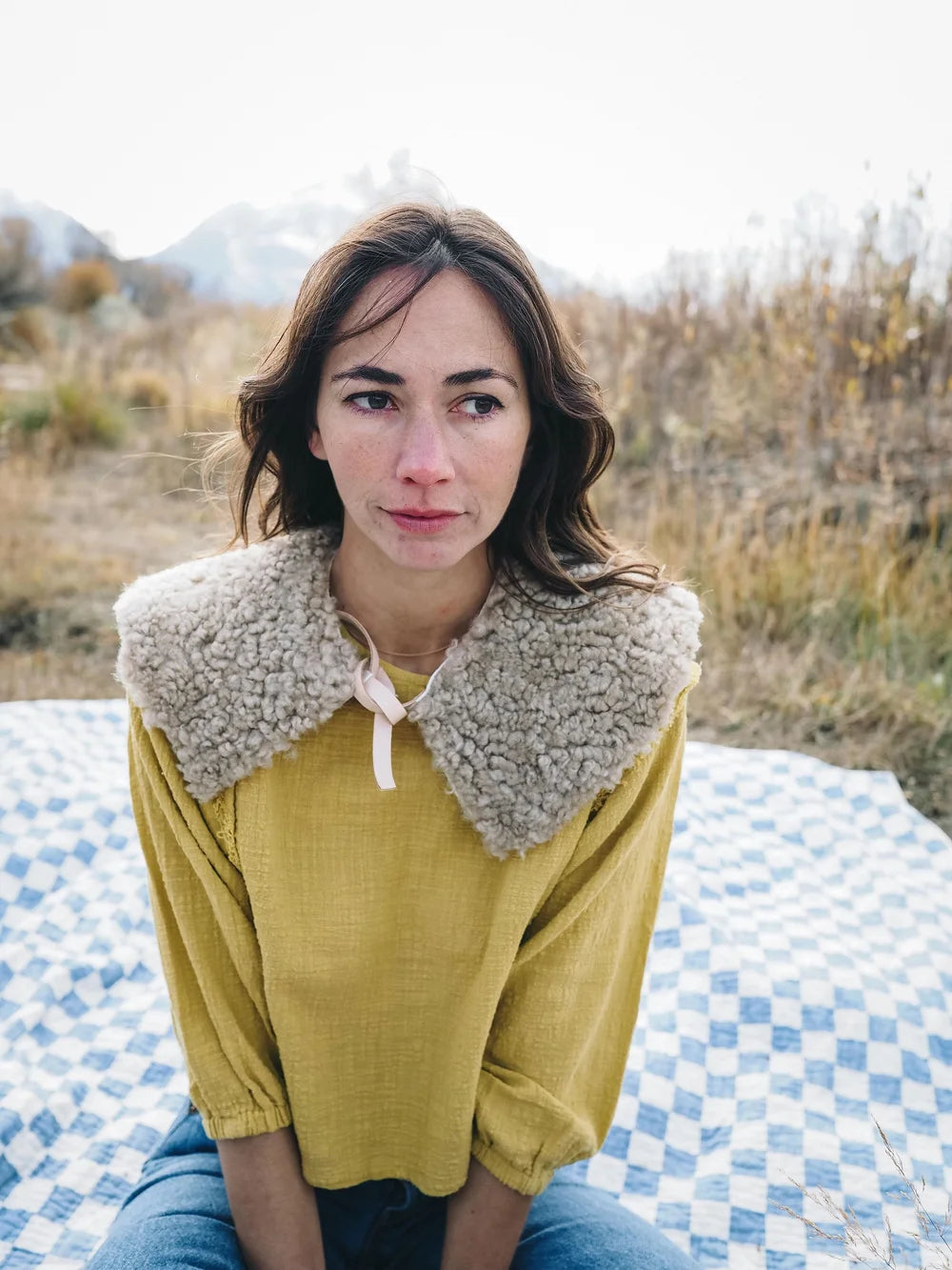 A playful take on the Shepherdess Collar in a shorthair curly hide, in a delicate off-white or taupe/grey color way.