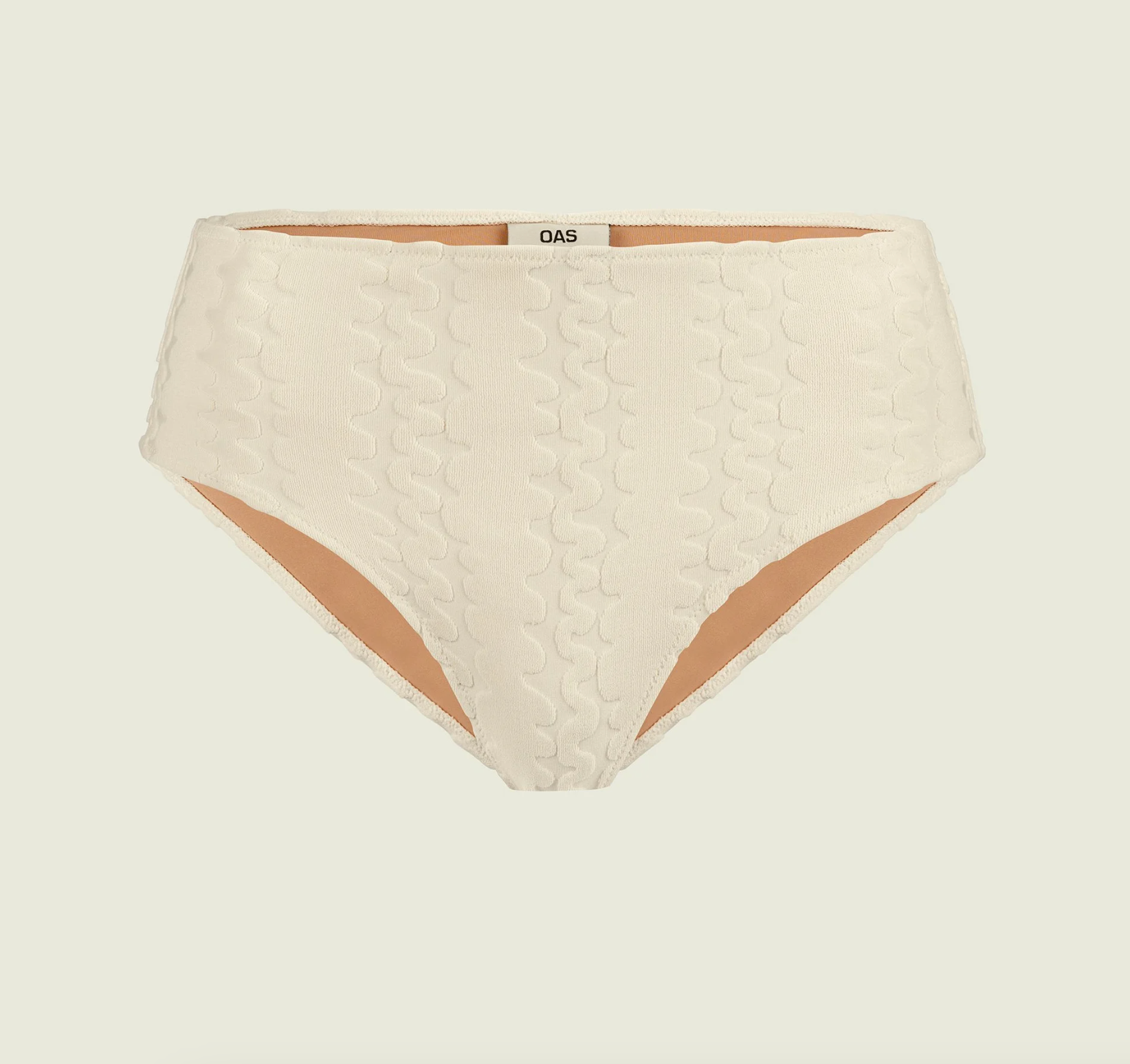 The Ecru Scribble Riva bikini bottom is shaped to a high-rise fit with a ruched back and elevated leg line. Jacquard-woven from swim terry to a pattern of textural waves reminiscent of sandy shores. Fully lined.