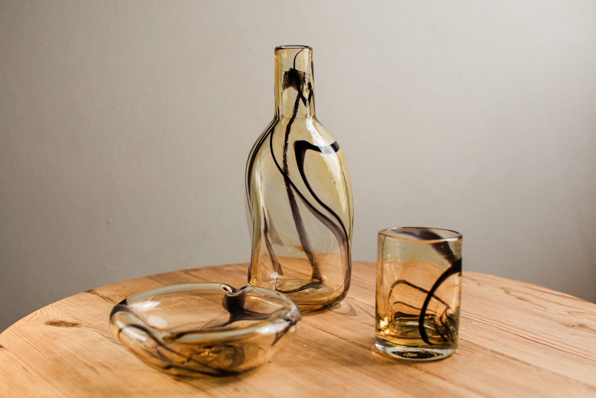 A glass emulating tendrils of smoke and splashes of tobacco.