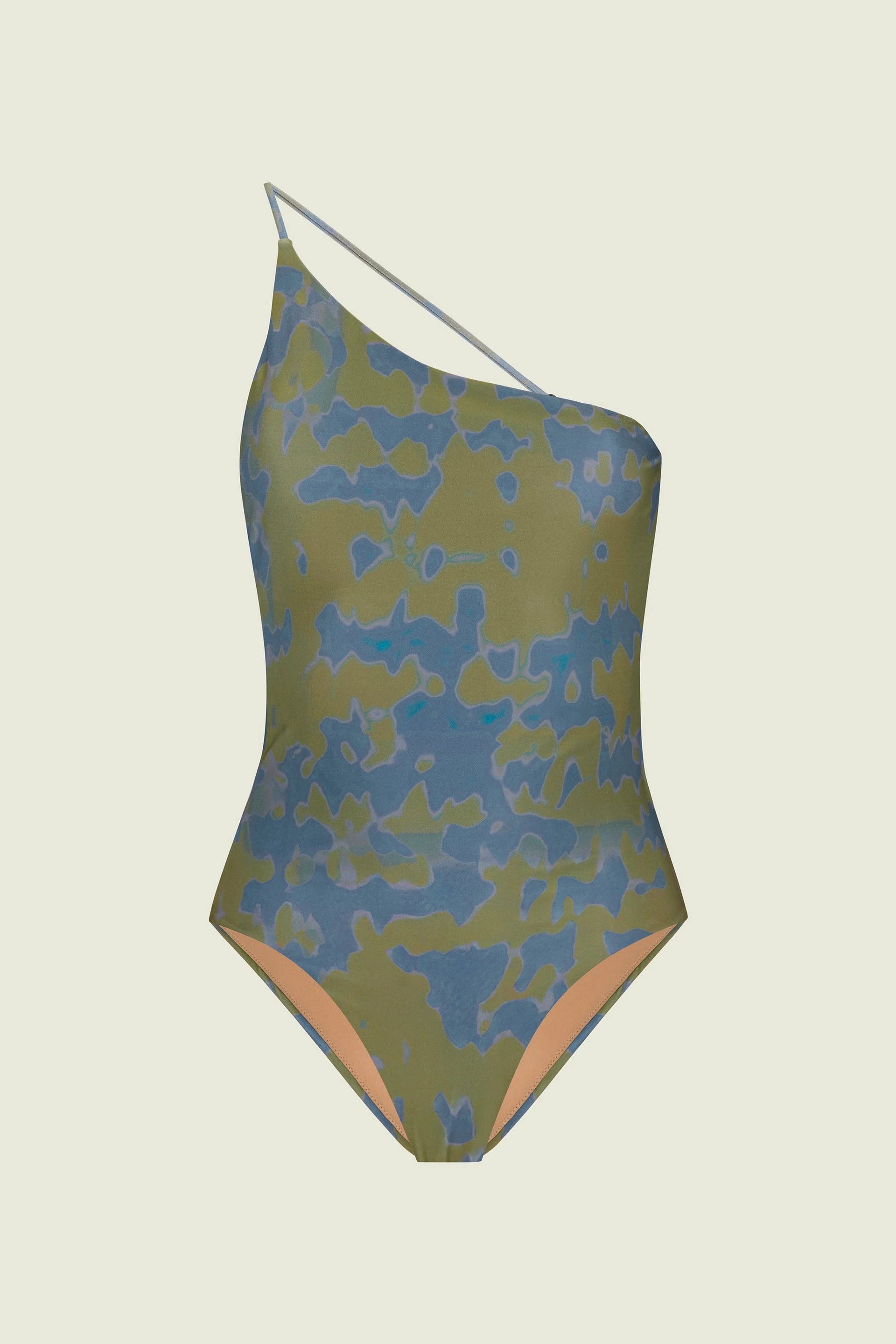 The Highland Tuffo bathing suit is shaped to a one-shoulder silhouette that turns to reveal an open back. Made in a UV-protective stretch fabric with a soft sheen, based on recycled nylon—it has a modern, minimalist cut with concealed seams for a sleek look. Printed with an abstract motif that reflects the irregular beauty of nature. Fully lined.