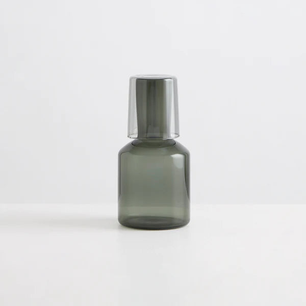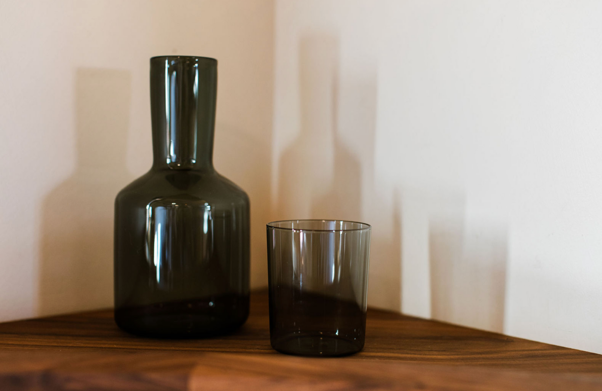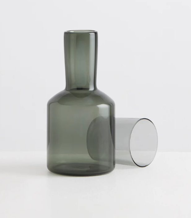 The J’ai Soif carafe and tumbler are expertly crafted from smoke Borosilicate glass, inspired by the traditional drinkware sets displayed on bedside tables in France. The J’ai Soif carafes sophisticated design lines and bold colour adds extraordinary pleasure to the simple act of drinking water.