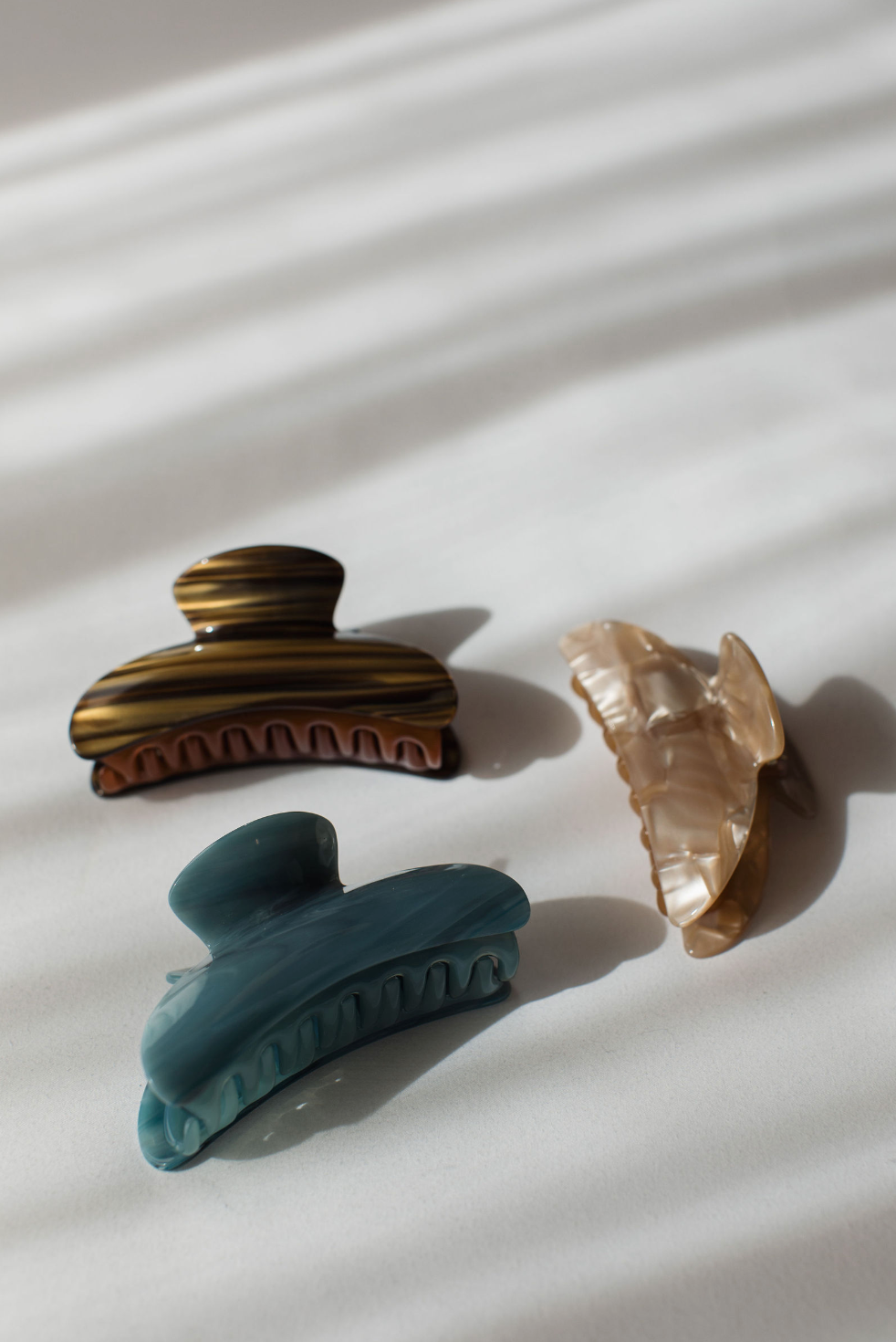 A double-walled hair claw designed to hold medium volumes of hair, handcrafted from Italian acetate with reinforced hardware. Recommended for all hair types and textures.