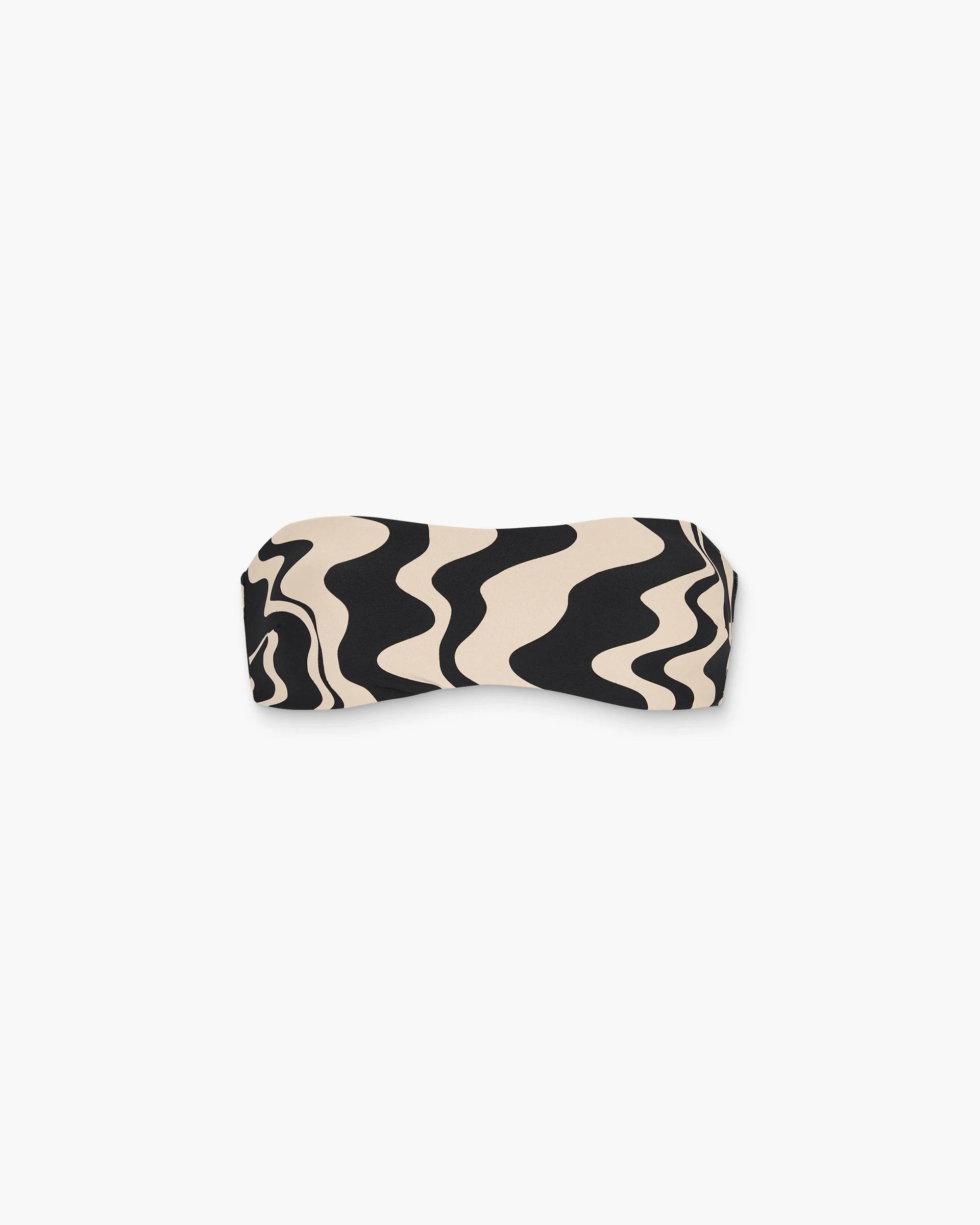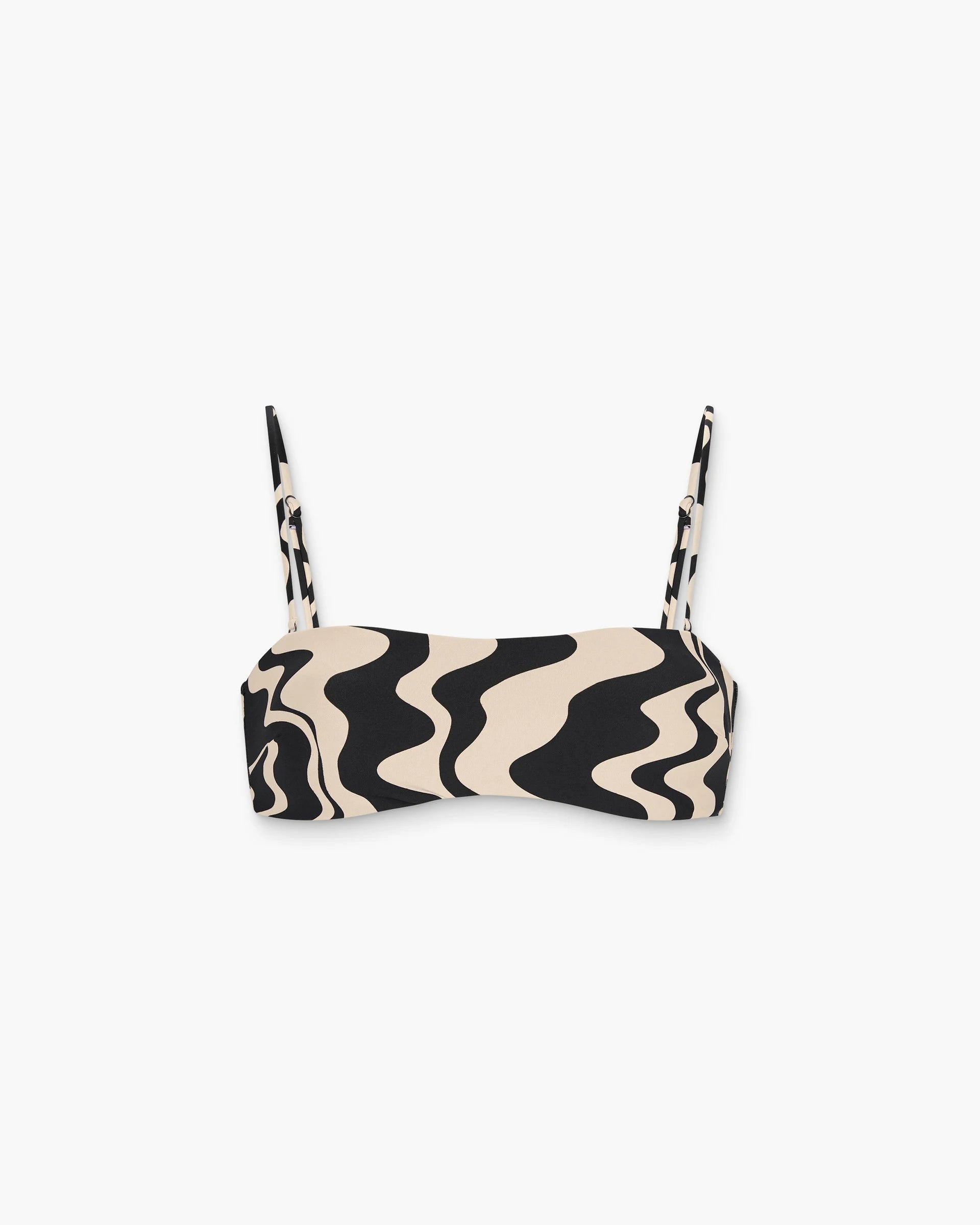 The Nero Verve Baia bikini top is made from an UV-protective stretch fabric with a soft sheen, based on recycled nylon. The bandeau silhouette comes with a silicone trim inside and optional spaghetti straps. Fully lined with removable cups offering gentle support. Swaying stripes mimic the rhythm of beachside waves.