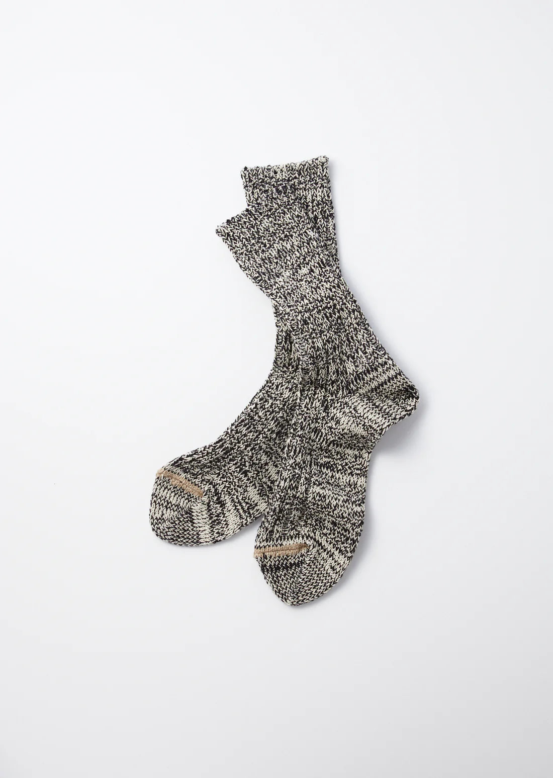 These chunky socks are knitted with a rare traditional machine with thick recycled cotton yarn that is often used for hand-knitting. ROTOTO always opts for recycled cotton yarn developed by a yarn company based also in Nara Prefecture. Their environment-minded product is made out of cotton waste from spinneries in Japan by re-spinning it with unique techniques. Although the material is more likely to get frayed, the mixed heather color made with two-strand yarn makes dirt and fuzz less visible.